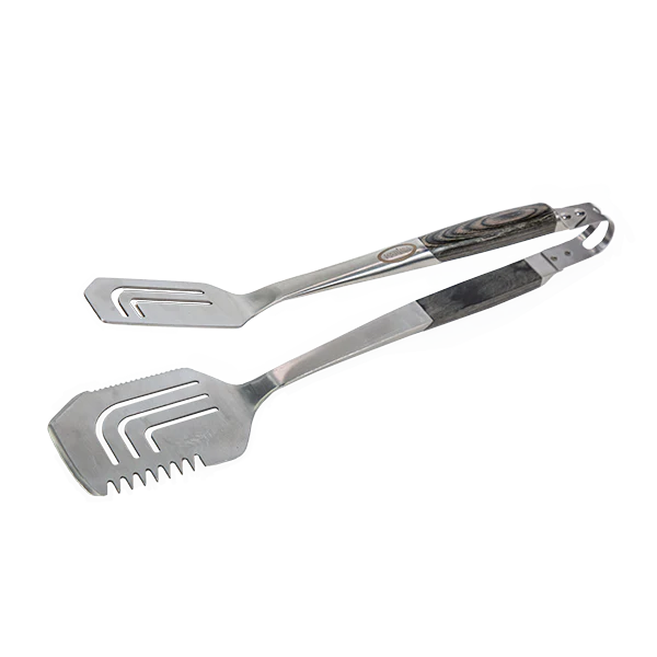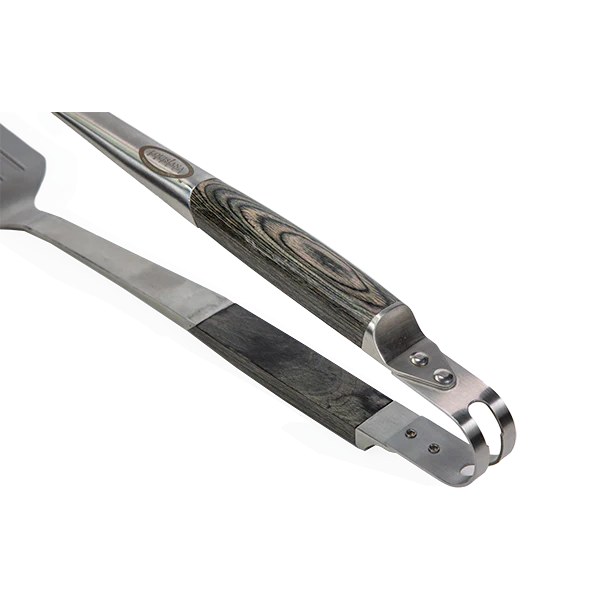 Experience a tool that can do it all with the Louisiana Grills All-in-One Tool. Thanks to the double-spatula tong design, you can do everything that your spatula, tongs, meat clever and tenderizer can do – in one tool. Securely flip burgers and steaks or grab small foods like shrimp vegetables with ease. The dual-edge spatula head makes this tool an excellent choice to have nearby when preparing meats. Additional features include a premium wood-finished handle, dependable stainless-steel build, and quick access hanging loop.